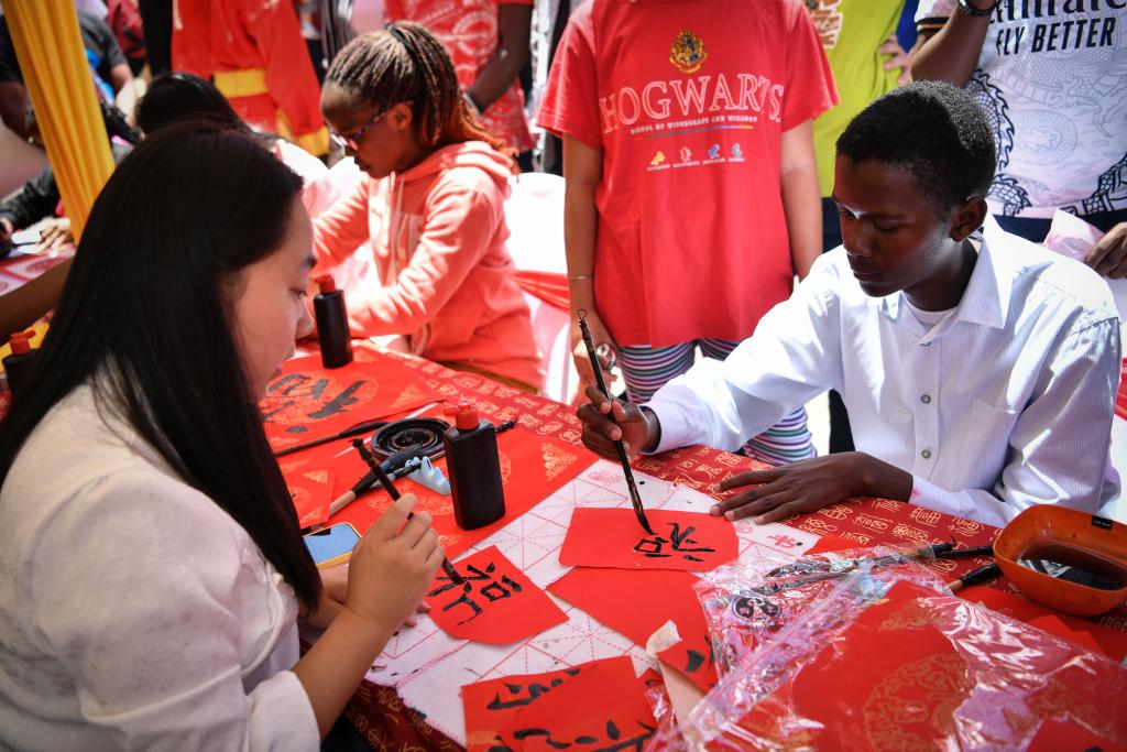 2月10日,在肯尼亞首都內(nèi)羅畢,人們在內(nèi)羅畢中國春節(jié)廟會(huì)上體驗(yàn)中國書法。(新華社記者韓旭 攝)