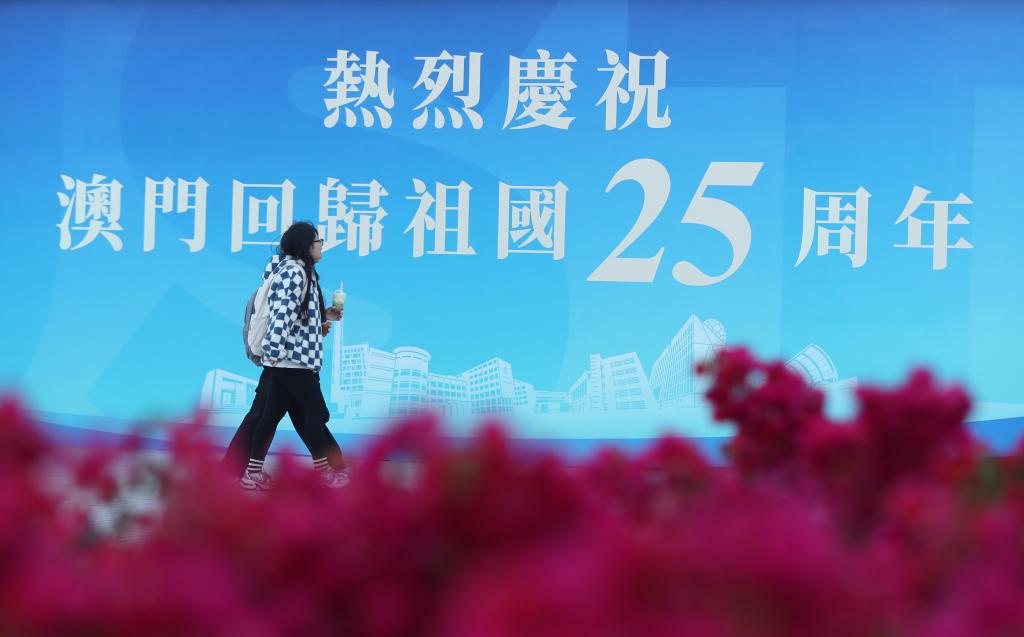 12月17日,行人經(jīng)過澳門科技大學(xué)校園內(nèi)的一處慶祝海報。新華社記者 姚琪琳 攝