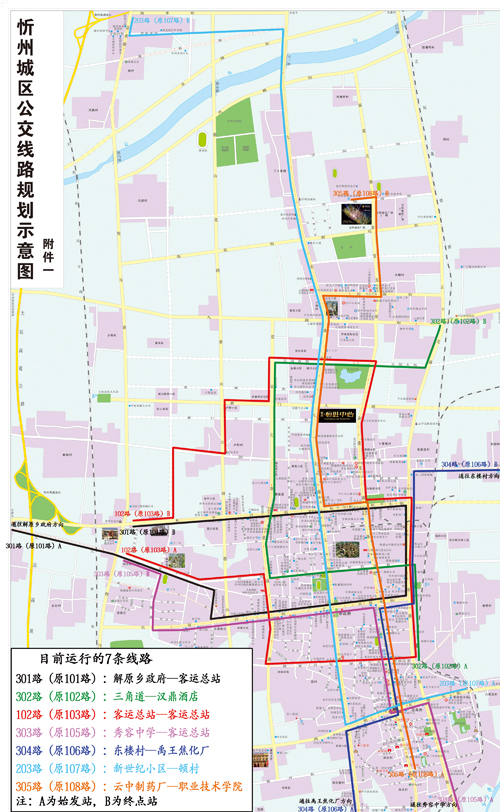 途經(jīng)站點:解原鄉(xiāng)政府→佐城村口→流江村口→新路村口→供熱公司→燕山加油站→田家炳中學(xué)→逯家莊村口→武警支隊→寧靜大廈→廣電大樓→忻州六中→日月廣場→忻州市人民政府→君華新天地購物廣場→洗滌化妝品→火車站→云中路小學(xué)→和平廣場→市人民銀行→忻州師院→建設(shè)路口→忻州市供水公司→客運總站(北),共24個站點。