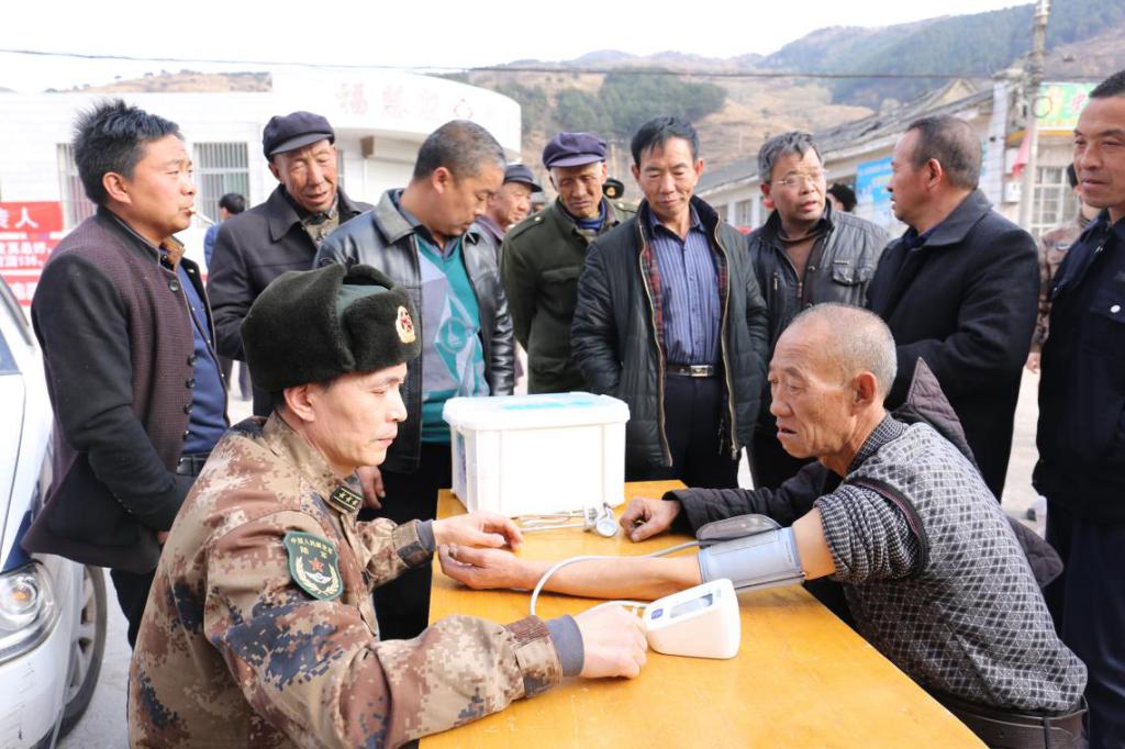 衛(wèi)生隊領(lǐng)導(dǎo)為村民測量血壓。劉志剛 攝