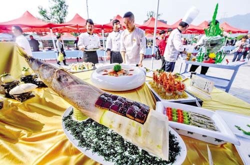 竹筍是杭州市臨安區(qū)的經(jīng)濟(jì)主產(chǎn)業(yè),被稱為臨安農(nóng)民的第一棵“搖錢樹”?!鞍俟S宴”是臨安傳統(tǒng)的特色名宴,被認(rèn)定為“中華特色名宴”,其包含的與竹筍有關(guān)的數(shù)百道筍菜佳肴,凝聚著濃厚的吳越美食文化。這是“百筍宴”活動現(xiàn)場展示的與筍有關(guān)的特色菜肴據(jù)新華社 記者 徐 昱 攝