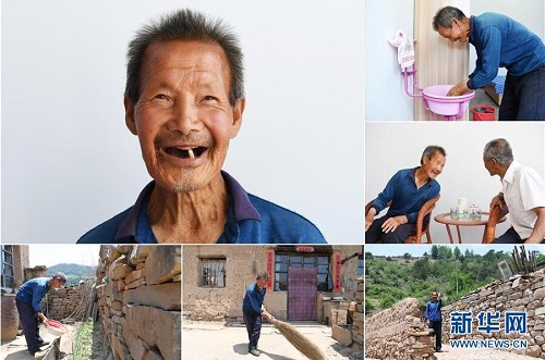 魏連保,男,1949年出生,山西省長治市沁源縣支角村人。獨(dú)居的他生活不便,2017年年底,村委會為魏連保在內(nèi)的8位老人修建了一排整齊的新居,并統(tǒng)一安排就餐。 左上:魏連保肖像;右上:魏連保在新居洗臉;右中:魏連保(左)在新居和鄰居李秀成聊天;下右:魏連保在舊居前留影;下中:魏連保在舊居打掃院子;下左:魏連保在舊居為蔬菜澆水(拼版照片,6月18日攝)。 地處晉東南的山西省長治市,位于由太行山、太岳山環(huán)繞而成的上黨盆地中。在群山中、崖壁上,許多村莊自然條件惡劣,基礎(chǔ)設(shè)施落后,脫貧致富是大山深處人們的迫切心愿。 近年來,一場場脫貧攻堅(jiān)戰(zhàn),在一個(gè)個(gè)深山村打響。政府全力探索脫貧路徑的同時(shí),山區(qū)百姓因地制宜,靠自己的雙手和智慧走上致富路,交出了一份扎實(shí)的脫貧答卷。 記者在太行山、太岳山一路尋訪,記錄下多位70歲老人的生活。這些共和國的同齡人,親歷了山鄉(xiāng)的巨變,見證著長治山區(qū)脫貧攻堅(jiān)偉大工程的一步步推進(jìn)。 新華社記者 楊晨光 攝