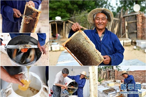 王巨才,男,1949年出生,山西省長治市武鄉(xiāng)縣鳳臺坪村人,2014年被列入建檔立卡貧困戶。2016年,在當(dāng)?shù)卣膸椭?,王巨才和兒子一起學(xué)習(xí)養(yǎng)蜂技術(shù),發(fā)展養(yǎng)蜂產(chǎn)業(yè)。2018年,王巨才銷售蜂蜜收入達(dá)到4萬多元。 右上:王巨才肖像;左上:王巨才在去除蜂板上的蜂蠟;左中:王巨才使用搖蜜機取蜜;左下:王巨才將蜂蜜裝到瓶子里;下中:王巨才(右)和兒子將搖蜜機里的蜜倒出;下右:王巨才在整理蜂箱(拼版照片,6月11日攝)。 地處晉東南的山西省長治市,位于由太行山、太岳山環(huán)繞而成的上黨盆地中。在群山中、崖壁上,許多村莊自然條件惡劣,基礎(chǔ)設(shè)施落后,脫貧致富是大山深處人們的迫切心愿。 近年來,一場場脫貧攻堅戰(zhàn),在一個個深山村打響。政府全力探索脫貧路徑的同時,山區(qū)百姓因地制宜,靠自己的雙手和智慧走上致富路,交出了一份扎實的脫貧答卷。 記者在太行山、太岳山一路尋訪,記錄下多位70歲老人的生活。這些共和國的同齡人,親歷了山鄉(xiāng)的巨變,見證著長治山區(qū)脫貧攻堅偉大工程的一步步推進(jìn)。 新華社記者 詹彥 攝