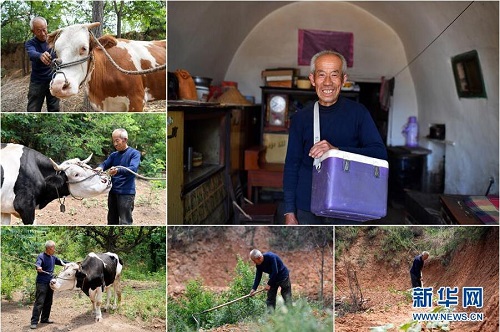 曹晉忠,男,1949年出生,山西省長治市武鄉(xiāng)縣鋪上村人。曹晉忠是村里的動物防疫員,自己種了4畝玉米、2畝小米。因為妻子常年臥病在床,曹晉忠一家是該村的精準扶貧對象。曹晉忠說,醫(yī)護人員經常上門進行健康狀況隨訪,駐村工作隊也常來家里幫忙,現在看病不發(fā)愁,干活有人幫,生活挺好的。 右上:曹晉忠肖像;左上、左中、左下:曹晉忠在給村里的牛做檢查;下中、下右:曹晉忠在地里干農活(拼版照片,6月12日攝)。 地處晉東南的山西省長治市,位于由太行山、太岳山環(huán)繞而成的上黨盆地中。在群山中、崖壁上,許多村莊自然條件惡劣,基礎設施落后,脫貧致富是大山深處人們的迫切心愿。 近年來,一場場脫貧攻堅戰(zhàn),在一個個深山村打響。政府全力探索脫貧路徑的同時,山區(qū)百姓因地制宜,靠自己的雙手和智慧走上致富路,交出了一份扎實的脫貧答卷。 記者在太行山、太岳山一路尋訪,記錄下多位70歲老人的生活。這些共和國的同齡人,親歷了山鄉(xiāng)的巨變,見證著長治山區(qū)脫貧攻堅偉大工程的一步步推進。 新華社記者 詹彥 攝