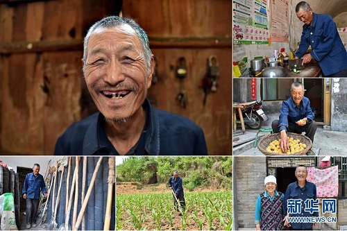 李增福,男,1949年出生,山西省長(zhǎng)治市潞城區(qū)上黃村人,自己和老伴都患有較嚴(yán)重的慢性病,家里6口人靠種植6畝玉米地為生,生活貧困。2016年女兒和女婿參加了村里組織的脫貧技能培訓(xùn)并開(kāi)了一家特色面食店,家里的日子逐漸好了起來(lái)。 左上:李增福肖像;右上:李增福在切菜;右中:李增福在晾曬剛摘的杏;右下:李增福和老伴合影;下中:李增福在田地里鋤草;下左:李增福在挑選農(nóng)具(拼版照片,6月11日攝)。 地處晉東南的山西省長(zhǎng)治市,位于由太行山、太岳山環(huán)繞而成的上黨盆地中。在群山中、崖壁上,許多村莊自然條件惡劣,基礎(chǔ)設(shè)施落后,脫貧致富是大山深處人們的迫切心愿。 近年來(lái),一場(chǎng)場(chǎng)脫貧攻堅(jiān)戰(zhàn),在一個(gè)個(gè)深山村打響。政府全力探索脫貧路徑的同時(shí),山區(qū)百姓因地制宜,靠自己的雙手和智慧走上致富路,交出了一份扎實(shí)的脫貧答卷。 記者在太行山、太岳山一路尋訪,記錄下多位70歲老人的生活。這些共和國(guó)的同齡人,親歷了山鄉(xiāng)的巨變,見(jiàn)證著長(zhǎng)治山區(qū)脫貧攻堅(jiān)偉大工程的一步步推進(jìn)。 新華社記者 曹陽(yáng) 攝