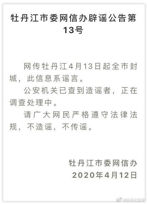 網(wǎng)傳牡丹江4月13日起全市封城,此信息系謠言。公安機(jī)關(guān)已查到造謠者,正在調(diào)查處理中。請(qǐng)廣大網(wǎng)民嚴(yán)格遵守法律法規(guī),不造謠,不傳謠。