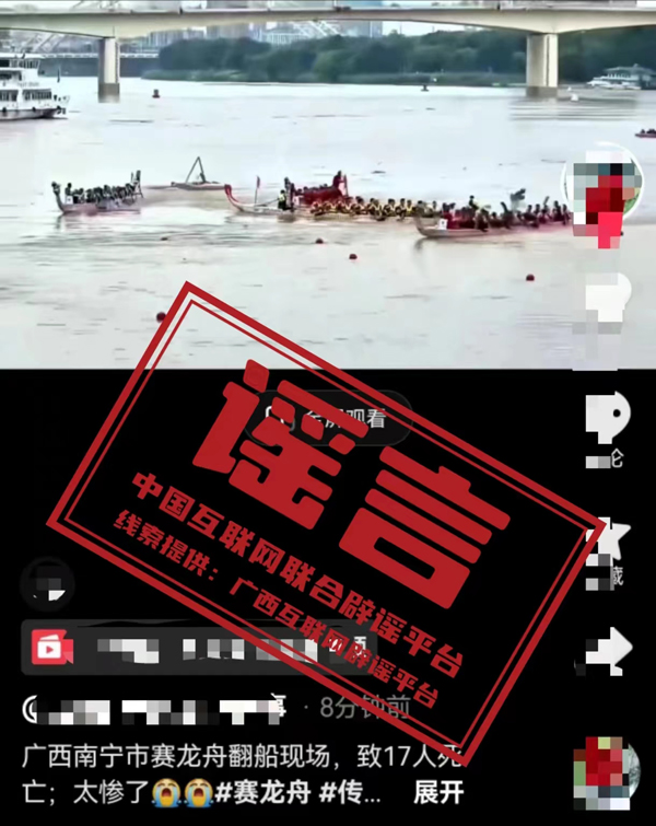 真相:近日,有網(wǎng)友在短視頻平臺(tái)發(fā)視頻稱“南寧市賽龍舟翻船致人員傷亡”。經(jīng)廣西壯族自治區(qū)南寧市互聯(lián)網(wǎng)舉報(bào)辟謠平臺(tái)向南寧市體育局核實(shí),大賽期間,南寧市紅十字會(huì)、南寧市應(yīng)急管理局和消防救援支隊(duì)安排50余名持有救生員資格證的救生人員、10臺(tái)救生艇隨時(shí)待命,比賽期間發(fā)生賽艇傾覆的緊急情況后,應(yīng)急救援隊(duì)第一時(shí)間組織救援力量開展施救,成功地將傾覆的賽艇和落水運(yùn)動(dòng)員一一救起,未致人員傷亡。網(wǎng)傳“南寧市賽龍舟翻船致人員傷亡”系謠言。(來(lái)源:廣西互聯(lián)網(wǎng)違法和不良信息舉報(bào)、“南寧舉報(bào)辟謠”微信公眾號(hào))