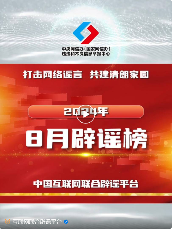 打擊網(wǎng)絡謠言 共建清朗家園 中國互聯(lián)網(wǎng)聯(lián)合辟謠平臺2024年8月辟謠榜