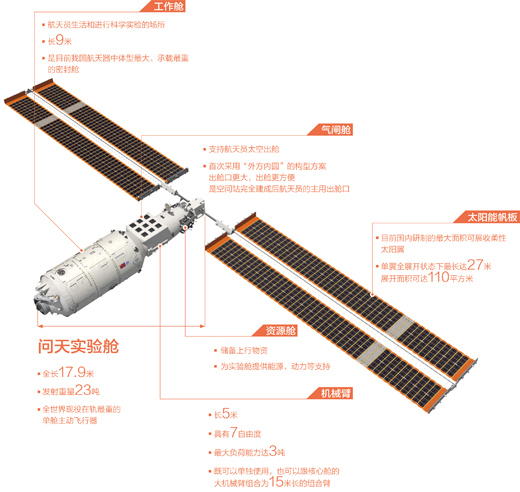 結構上,問天實驗艙由用來完成科學實驗的工作艙、支持太空出艙的氣閘艙及儲備上行物資的資源艙3部分組成。