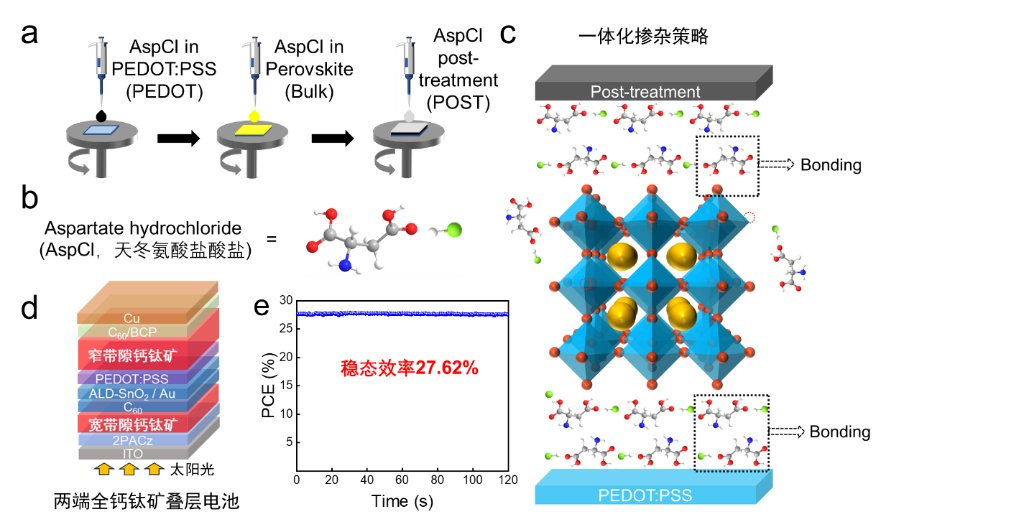 為此,研究團(tuán)隊將天冬氨酸鹽酸鹽引入到全鈣鈦礦疊層太陽能電池底部的空穴傳輸層、鈣鈦礦體吸光層和上界面層中,開發(fā)了一種采用同一分子處理的一體化摻雜策略,極大地改善了鈣鈦礦薄膜的質(zhì)量。除了與鈣鈦礦前驅(qū)體配位外,天冬氨酸鹽酸鹽分子還具有很強(qiáng)的分子間氫鍵,富集在鈣鈦礦上、下界面處的天冬氨酸鹽酸鹽因此充當(dāng)了鈣鈦礦層和傳輸層界面之間的分子鎖,進(jìn)一步提升了鈣鈦礦材料的性能和穩(wěn)定性。