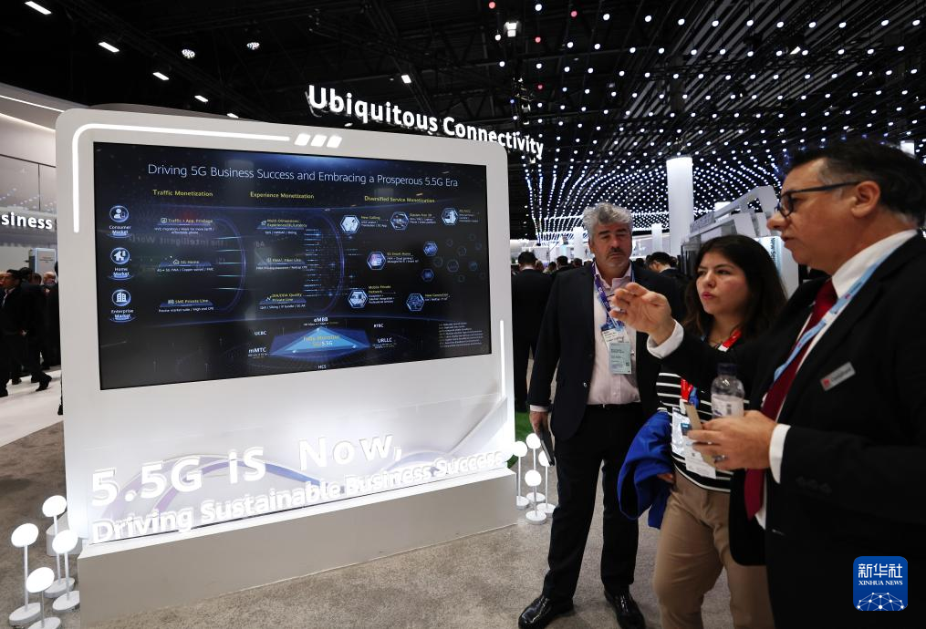 2月28日,在西班牙巴塞羅那舉行的2024年世界移動(dòng)通信大會(huì)上,人們?cè)谌A為展臺(tái)關(guān)注5G-A技術(shù)。新華社記者高靜 攝