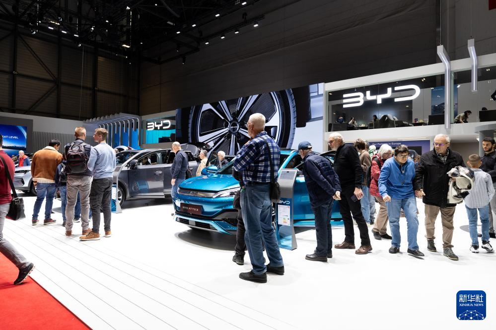 這是2月28日在瑞士日內(nèi)瓦舉行的2024年日內(nèi)瓦國(guó)際車(chē)展上拍攝的比亞迪展臺(tái)。新華社記者孟鼎博 攝
