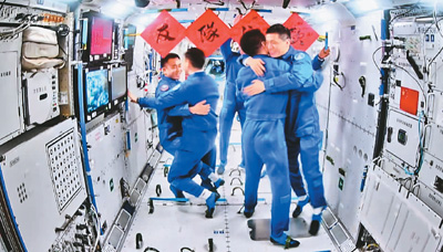 4月26日在軌執(zhí)行任務的神舟十七號航天員乘組順利打開“家門”,歡迎遠道而來的神舟十八號航天員乘組入駐“天宮”。新華社記者 金良快攝