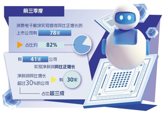 今年以來,消費(fèi)電子板塊復(fù)蘇明顯。數(shù)據(jù)顯示,前三季度,消費(fèi)電子板塊實(shí)現(xiàn)營(yíng)收同比正增長(zhǎng)的上市公司有78家,占比約82%;有41家公司實(shí)現(xiàn)凈利潤(rùn)同比正增長(zhǎng),凈利潤(rùn)同比增長(zhǎng)超過30%的公司有30家,占比超三成。尤其是第三季度,行業(yè)延續(xù)復(fù)蘇趨勢(shì),一批公司實(shí)現(xiàn)營(yíng)收、凈利潤(rùn)的雙增長(zhǎng)。