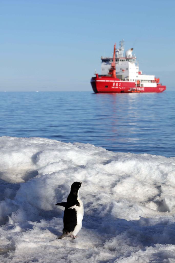 小企鵝遙望“雪龍2”號(hào)(12月27日攝)