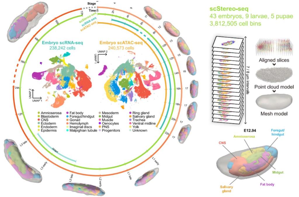 杭州華大生命科學研究院與南方科技大學創(chuàng)建了一個解碼動物發(fā)育過程的多模態(tài)數(shù)據(jù)集,生成了果蠅全發(fā)育周期的3D單細胞時空多組學圖譜,為生物發(fā)育提供了分子層面的參考,有望為發(fā)育缺陷及相關(guān)疾病機制研究奠定基礎(chǔ)。相關(guān)成果26日發(fā)表于國際學術(shù)期刊《細胞》。 研究人員介紹,動物發(fā)育是基因與細胞在時空維度上精密協(xié)作的復(fù)雜過程。以果蠅為例,其發(fā)育的過程,大體需要經(jīng)過卵、幼蟲、蛹和成蟲4個階段。如果說這個成長過程,是一場精密編排的“生命舞臺劇”,那么每個細胞何時何地“登場”、如何變成特定的細胞類型,便都是由基因“劇本”調(diào)控的。