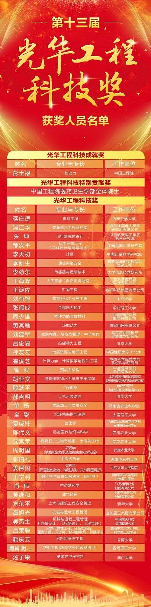 此外,還有機械工程專家蔣莊德、計量專家李天初、人工智能專家王海峰、特種功能金屬材料專家周少雄等不同學(xué)科領(lǐng)域的39位專家獲得光華工程科技獎,這些專家均以非凡的積極性和創(chuàng)造性,在各自領(lǐng)域取得了傲人成績,為我國工程科學(xué)技術(shù)事業(yè)的發(fā)展做出了巨大貢獻。