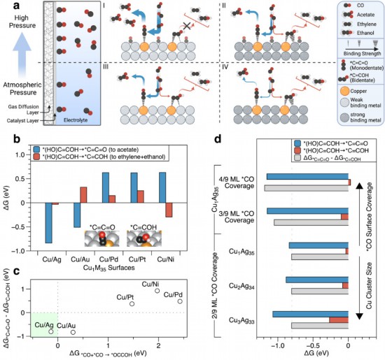 圖為該論文的理論計算,表明銅-銀稀釋合金催化劑表面更利于單齒型吸附的*C=C=O二碳基團的生成,及其需要更高的CO表面覆蓋度以保證碳-碳偶聯(lián)的高效發(fā)生。