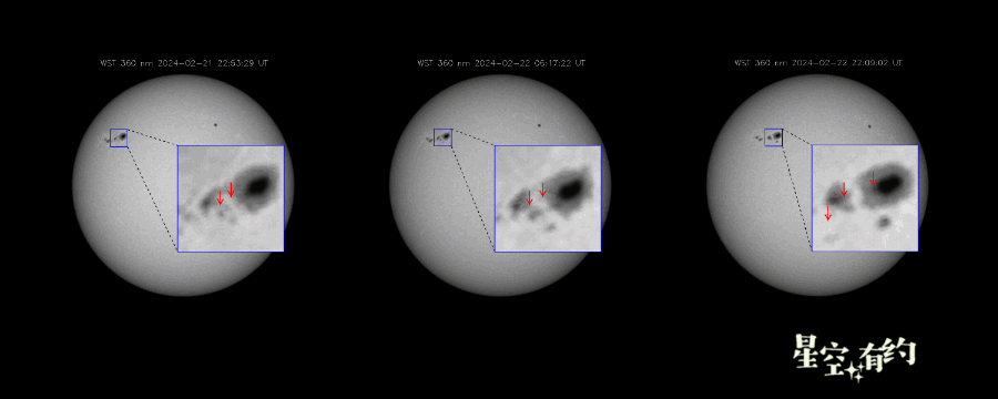 最近3個X級耀斑(22日X1.8級耀斑、22日X1.7級耀斑和23日X6.3級耀斑)發(fā)生時“夸父一號”白光望遠鏡拍攝到的影像。(“夸父一號”研究團隊供圖)