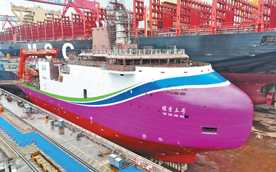 該船建造內(nèi)容包括船舶系統(tǒng)、載人深潛水面支持系統(tǒng)和綜合科考作業(yè)系統(tǒng),續(xù)航力1.5萬海里、載員80人,可為深遠(yuǎn)海地質(zhì)、環(huán)境和生命科學(xué)相關(guān)前沿問題研究提供所需的樣品和環(huán)境數(shù)據(jù),支持深海核心技術(shù)裝備的海上試驗與應(yīng)用。此次出塢后,將開展設(shè)備調(diào)試和系統(tǒng)聯(lián)調(diào)、船舶海試和科考設(shè)備海試等,預(yù)計于2025年完工交船、投入海上作業(yè)。
