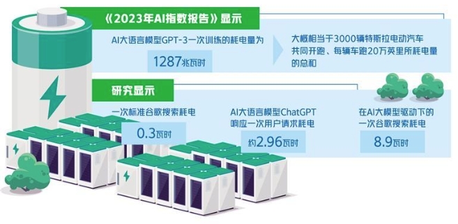 人工智能大模型到底有多耗能?據(jù)斯坦福人工智能研究所發(fā)布的《2023年AI指數(shù)報(bào)告》,AI大語言模型GPT-3一次訓(xùn)練的耗電量為1287兆瓦時(shí),大概相當(dāng)于3000輛特斯拉電動(dòng)汽車共同開跑、每輛車跑20萬英里所耗電量的總和。報(bào)告同時(shí)提出,AI大語言模型GPT-3一次訓(xùn)練,相當(dāng)于排放了552噸二氧化碳。
