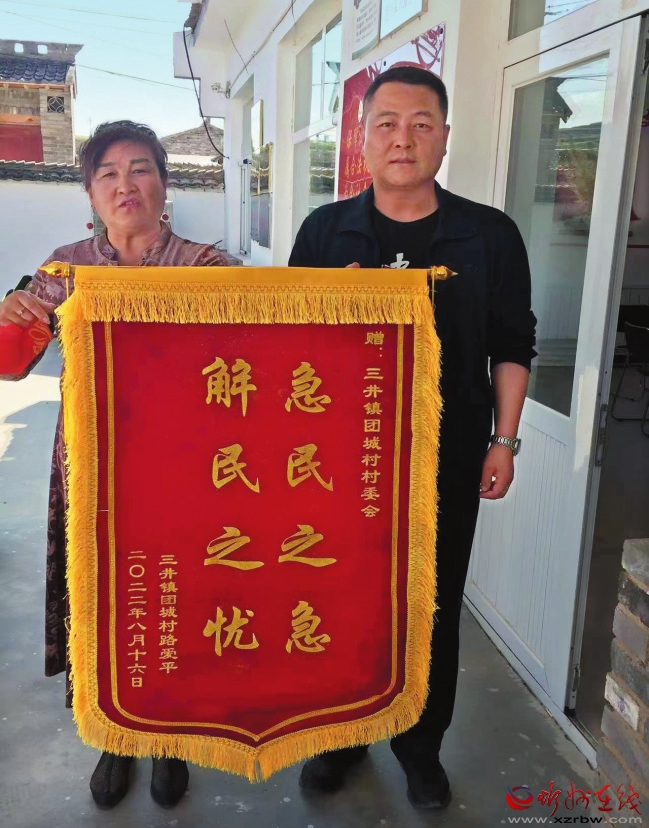 村民路愛平介紹說,去年8月9日,岢嵐縣遭遇到了幾十年不遇的特大暴雨侵襲,凌晨4點多,外出辦事的甄繼榮趕回村里,召集村兩委班子成員連夜巡查村民房屋是否有安全隱患,巡查到早上7點時,發(fā)現(xiàn)靠近河道居住的路愛平和吳貴生兩戶村民的護坡有被洪水沖刷的痕跡,存在安全隱患,當時還在下著大雨,村里也沒有工程機械,無奈之下,甄書記及時聯(lián)系了駐地部隊的勤務(wù)站,懇請出動一臺大型挖掘機救援。經(jīng)過部隊官兵3個小時奮戰(zhàn),挖出新的排洪渠道,臨時改變河水流動方向,保住了村民的住房,并及時在兩排房屋旁邊擋上防洪沙袋。洪水過后,他又積極爭取資金,在鄉(xiāng)政府的支持下,團城村修建了200米的護堤壩,加固了護坡。事后,村民路愛平到村委會送上了錦旗。