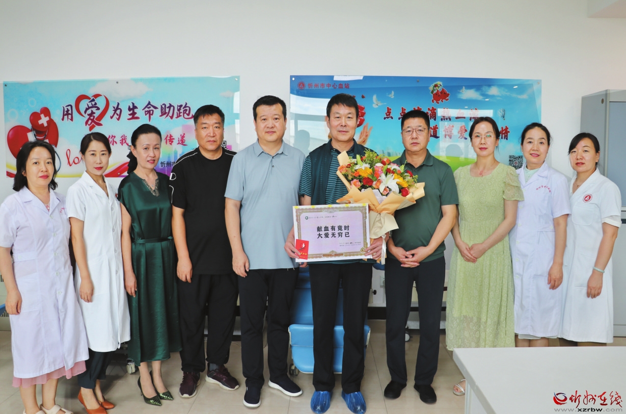 梁占海先生是我市繁峙籍人士,原計劃在7月18日,60周歲生日當(dāng)天完成最后一次獻血。連日暑浪滾滾,7月13日下午他瞅準(zhǔn)雨后氣溫下降的空隙,駕車125公里來到市中心血站,捐獻2治療量的血小板,在六十周歲生日,完成最后一獻“光榮退役”。血站郭建卿站長率班子成員到現(xiàn)場慰問,對他發(fā)揚人道主義精神,弘揚助人為樂品德的行動表示贊揚,對他為我市無償獻血事業(yè)做出的貢獻表示感謝。獻血結(jié)束后,中心血站的領(lǐng)導(dǎo)護士同梁占海先生合影留念,祝賀他花甲生日吉祥、身體健康。