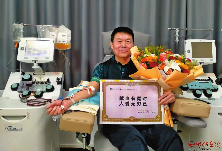 獻血有量,大愛無疆。梁占海表示,獻血雖然結(jié)束了,但自己將從此轉(zhuǎn)向無償獻血志愿服務(wù)隊伍,終身服務(wù)于無償獻血這一公益事業(yè)。(本報記者 王金華)