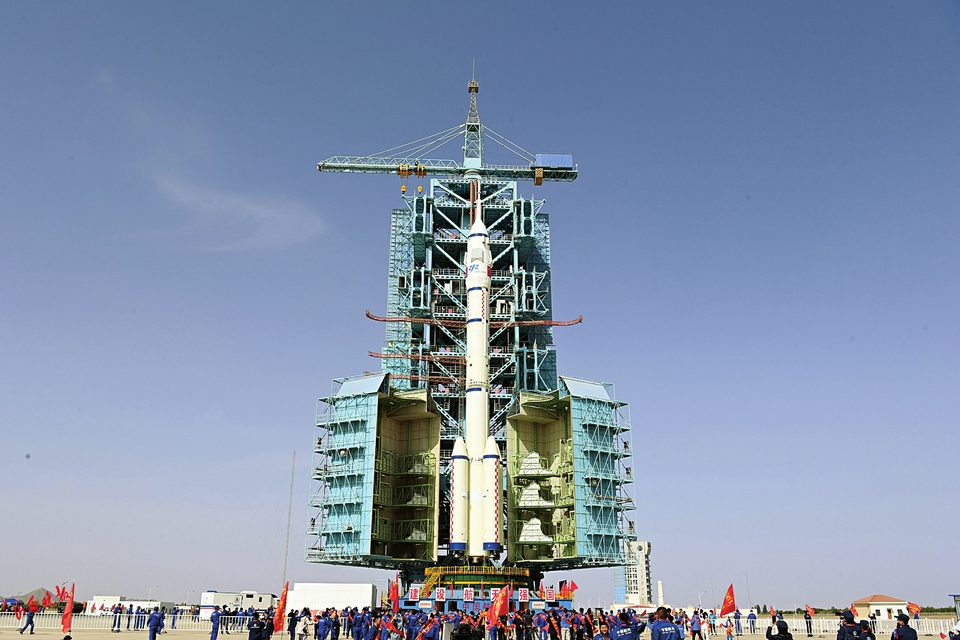 圖為5月22日,神舟十六號載人飛船與長征二號F遙十六運載火箭組合體轉運至發(fā)射塔架。