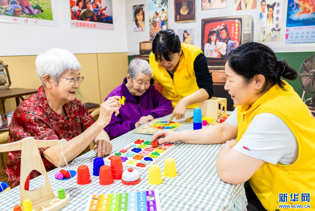 4月8日,工作人員在呼和浩特市玉泉區(qū)居家社區(qū)養(yǎng)老服務(wù)標(biāo)準(zhǔn)化示范中心陪老人做游戲。新華網(wǎng)發(fā)(丁根厚 攝)