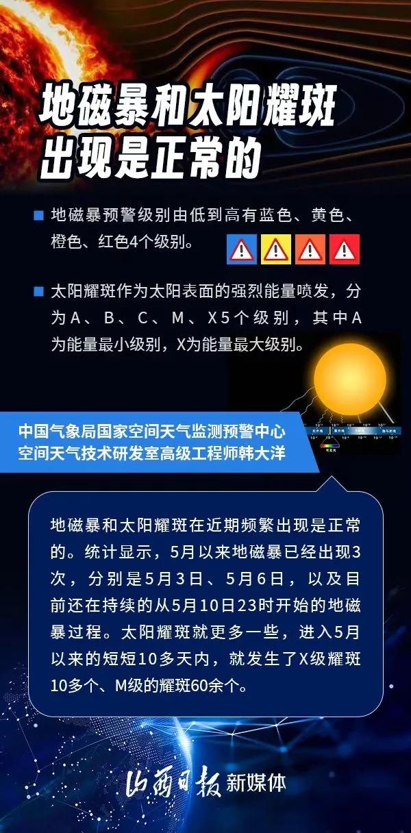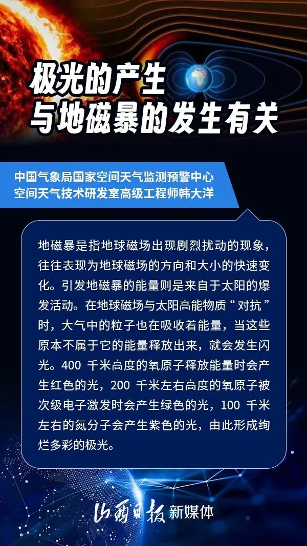 近日,我國多地出現(xiàn)極光現(xiàn)象,引起人們廣泛關(guān)注。極光現(xiàn)象與地磁暴活動密切相關(guān)。地磁暴以及近期頻繁出現(xiàn)的太陽耀斑為什么發(fā)生?對人們的生活有影響嗎?下面一起來看專家解讀。