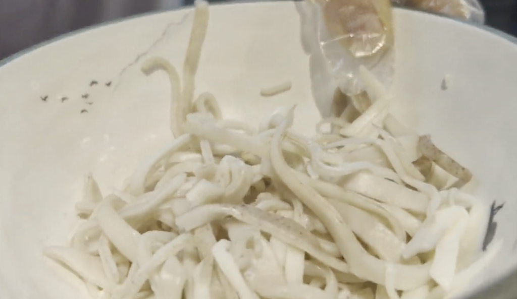 圖為夾心面。新華社記者 王怡靜 攝??關(guān)于剪刀面的故事很動(dòng)人——“‘剪子面,兩頭尖,吃到肚里胃不酸’。相傳剪刀面是以前喬家大院的喬貴發(fā)走西口的時(shí)候,留在家里的妻子為丈夫裁剪衣服,由于過(guò)于思念丈夫,一走神就把剪刀也帶到了廚房里,于是便有了剪子面?!覆凰帷鋵?shí)也是‘心不酸’。”李琨說(shuō)。剪刀面一般用來(lái)做湯面,配蔬菜吃,也有著希望家人安康的寄托。