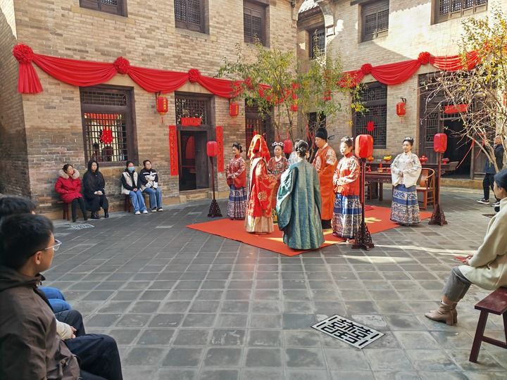隨著演員齊聲吟誦,古院落中,一場(chǎng)明制出閣禮正在上演。不大的小院擠滿了觀禮游客,院外不少人沒擠進(jìn)來,還在踮腳朝里望。這里是山西省高平市河西鎮(zhèn)的喜鎮(zhèn)蘇莊景區(qū)。