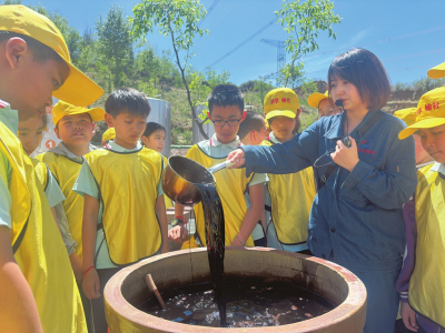 釀造廠內(nèi),研學(xué)的小朋友正在參觀傳統(tǒng)釀造技藝。本報(bào)記者張謙攝