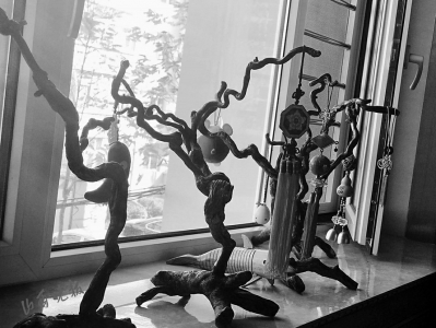 見到牛鳴遠(yuǎn)時(shí),他正忙著在家中的陽臺(tái)上懸掛兩個(gè)大樹枝。“這是棗樹枝,還有點(diǎn)濕,得掛起來晾干后才能再進(jìn)行加工。”牛鳴遠(yuǎn)說,朋友收拾平遙老家的房子時(shí),砍了院子里的大棗樹,知道他喜歡根雕,就專門運(yùn)回來一些送給他。