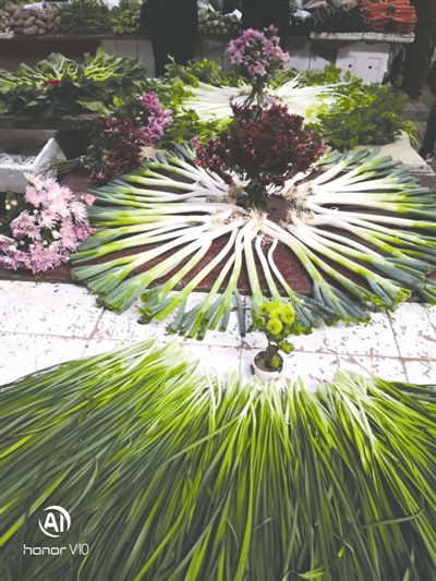 于是,王美成撿來(lái)廢棄的酒瓶子當(dāng)花瓶插花,每一處花瓶下擺放的都是不一樣的蔬菜,每天攤位上能見(jiàn)著七八種不同形狀的蔬菜造型花樣。6年來(lái),他一直堅(jiān)持?jǐn)[攤,在不同的季節(jié)用不同的鮮花進(jìn)行搭配。