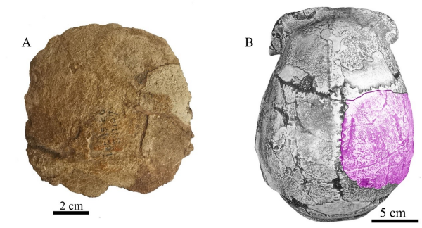 周口店第15號地點發(fā)現(xiàn)的人類頂骨化石。左側(cè):頂骨化石外側(cè)面觀;右側(cè):周口店直立人頭蓋骨模型頂面觀,示頂骨化石位置。圖片來源:中國科學(xué)院官網(wǎng)
