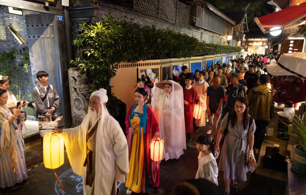9月29日,在成都寬窄巷子新“十二月市”街區(qū),裝扮成唐宋時代人物形象的演員在巡游表演。新華社記者 江宏景 攝