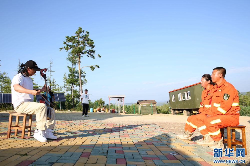 內蒙古大興安嶺烏蘭牧騎隊員走上爬松嶺管護瞭望站,為孫華李穎夫婦獻上精彩演出(拍攝于8月12日)。新華網石毅 攝