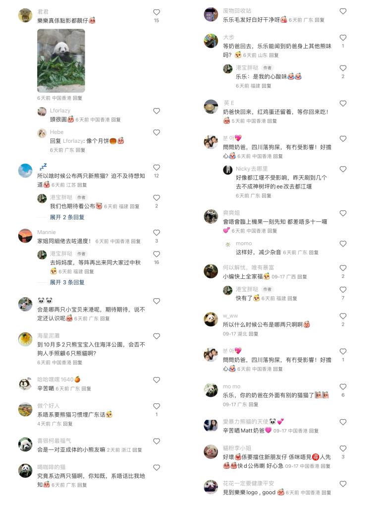 可愛的國(guó)寶牽動(dòng)眾多“熊貓迷”的心,隨著贈(zèng)港大熊貓消息的更新,網(wǎng)友們熱議的話題從“新熊貓是誰”“新熊貓何時(shí)能看到”,變成了“等‘奶爸’回去,樂樂能聞到‘奶爸’身上其他熊味嗎”“照顧6只熊貓人手夠嗎”“給新熊貓起什么新名字”……