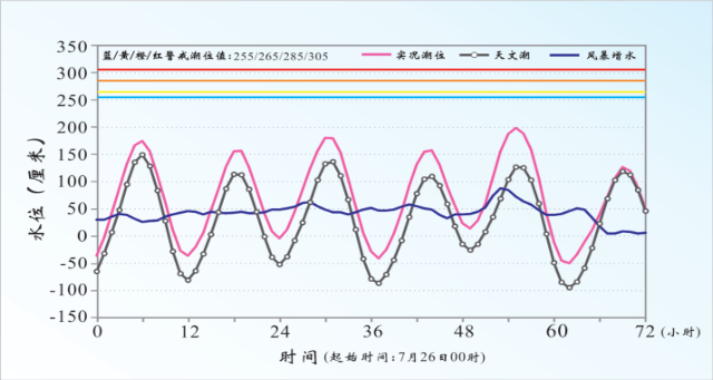 2023年7月28日“杜蘇芮”臺(tái)風(fēng)風(fēng)暴潮發(fā)生時(shí),福建東山站實(shí)測(cè)潮位、天文潮和風(fēng)暴增水隨時(shí)間變化情況,圖中清晰地反映出風(fēng)暴潮與天文潮疊加后,實(shí)時(shí)潮位明顯升高。(資料來(lái)源:《2023中國(guó)海洋災(zāi)害公報(bào)》)