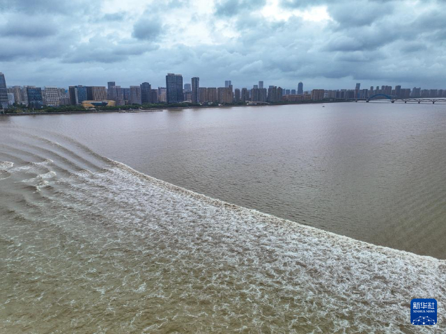 2024年9月19日拍攝的錢塘江潮水(無(wú)人機(jī)照片)。每年中秋節(jié)前后是錢塘江潮水的最佳觀賞期,被譽(yù)為“八月十八潮 壯觀天下無(wú)”。(圖片來(lái)源:新華社記者 江漢 攝)