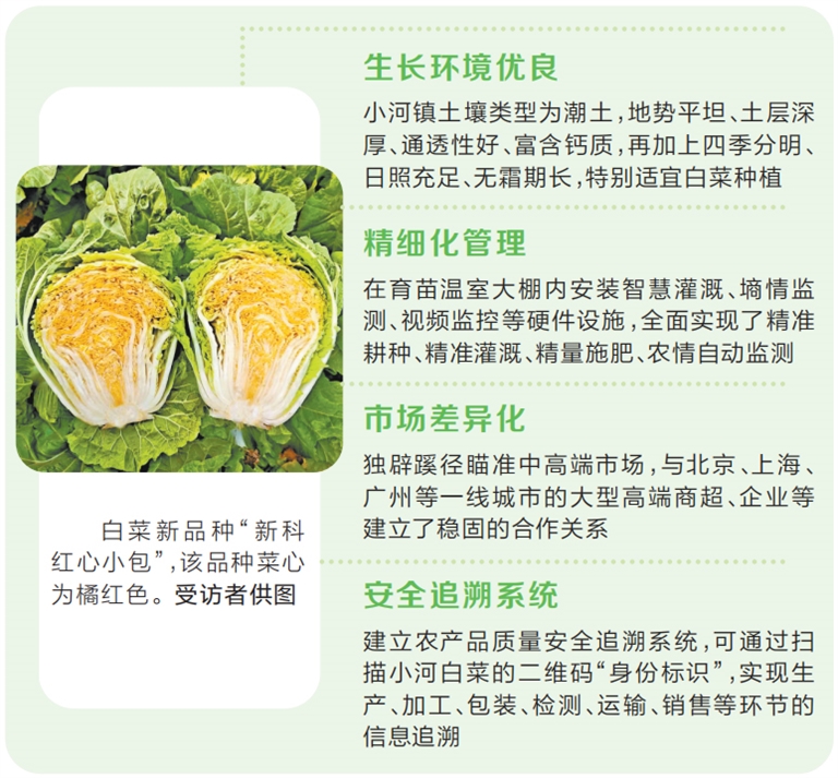 “好的品種培育是種出優(yōu)質(zhì)小河白菜的第一步,科學(xué)育苗則是最為關(guān)鍵的一環(huán)?!睆堒S民介紹,小河白菜賣得貴又賣得好的另一個(gè)重要原因是精細(xì)化管理——通過在育苗溫室大棚內(nèi)安裝智慧灌溉、墑情監(jiān)測、視頻監(jiān)控等硬件設(shè)施,全面實(shí)現(xiàn)了精準(zhǔn)耕種、精準(zhǔn)灌溉、精量施肥、農(nóng)情自動(dòng)監(jiān)測,進(jìn)而避免白菜干燒心的發(fā)生,提高白菜的產(chǎn)量和品質(zhì)。另外,新鄉(xiāng)市農(nóng)科院大白菜育種團(tuán)隊(duì)也會(huì)對(duì)白菜種植管理提供創(chuàng)新技術(shù)服務(wù),讓公司通過更新品種、科學(xué)管理,從而增加收入。
