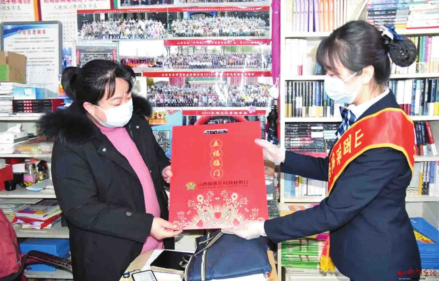保德農(nóng)商銀行組織開展新春送禮活動,客戶經(jīng)理對周邊商戶挨家挨戶拜訪,送去節(jié)日問候,積極宣傳存貸款產(chǎn)品,回訪商家二維碼、手機銀行使用情況,在商戶不能抽出時間到網(wǎng)點辦理業(yè)務(wù)時,主動提供上門服務(wù),幫助解決實際問題,既拉近了與周邊商戶的感情,也進一步宣傳了金融知識,展示了金融產(chǎn)品,促進了“首季開門紅”業(yè)務(wù)發(fā)展。 (吳波 攝)