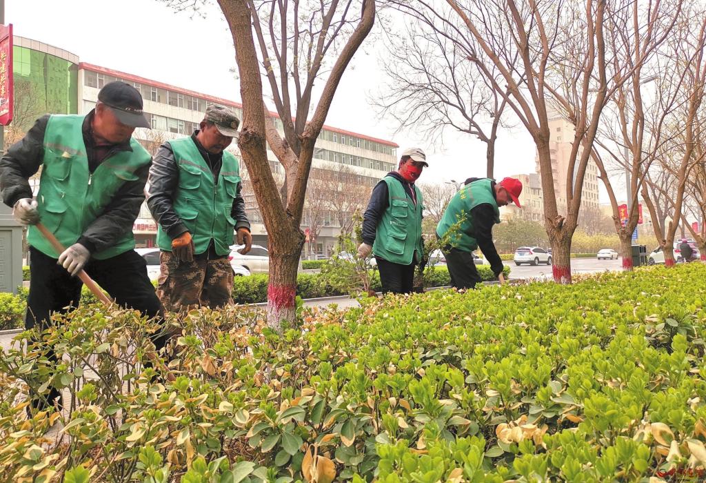 4月14日,新綠園林隊(duì)工作人員正在忻州城區(qū)長征西街補(bǔ)植綠籬。忻府區(qū)從三月上旬開始啟動春季植綠補(bǔ)綠工作,對部分道路、小微地塊等進(jìn)行植綠補(bǔ)綠,消除黃土裸露,提升整體綠化水平。(宮清華 攝)