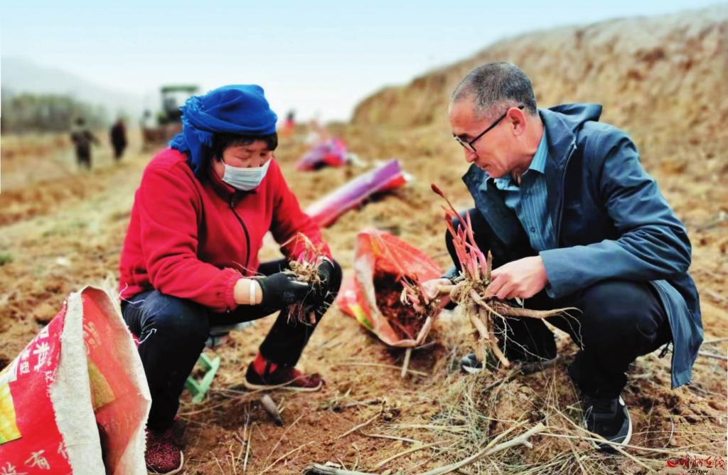 近日,五臺(tái)縣陽白鄉(xiāng)桑院村北部嶺坡地種植的大片芍藥進(jìn)入收獲季。村黨支部書記、村委會(huì)主任李肖峰帶領(lǐng)村民忙著機(jī)械采挖、分級(jí)歸類、拾撿裝運(yùn)、晾曬、銷售等,田間地頭一派忙碌景象。多年來,陽白鄉(xiāng)黨委政府不斷調(diào)整農(nóng)業(yè)產(chǎn)業(yè)結(jié)構(gòu),通過鼓勵(lì)農(nóng)民種植芍藥、黃芩、黃芪等中藥材,帶動(dòng)當(dāng)?shù)厝罕娫鍪罩赂弧I蠄D為機(jī)械采挖場景;下圖為李肖峰為村民講解藥材分級(jí)歸類注意事項(xiàng)。(王金龍攝)