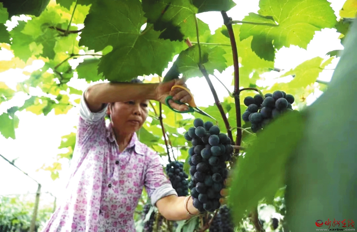 走進(jìn)葡萄大棚,一排排葡萄架整整齊齊,架上綴滿(mǎn)的,便是今天的主角——“夏黑”葡萄了。只見(jiàn)一串串珠圓玉潤(rùn)、晶瑩剔透的葡萄,沉甸甸地掛滿(mǎn)枝頭,讓人垂涎欲滴。沿著畦間往里,一串串葡萄迎面而來(lái),像一場(chǎng)盛大的表演,你方唱罷我登場(chǎng),像珠寶店價(jià)值連城的上等珍珠,爭(zhēng)著奇、斗著艷,又像棲在枝頭上的鳥(niǎo)雀?jìng)?,嘰嘰喳喳地聊個(gè)不?!r(nóng)正帶著游客們采摘,大家左看看、右看看,相中了就剪下來(lái)裝箱。閑聊間,隨手摘下來(lái)一顆丟進(jìn)口中:真甜!