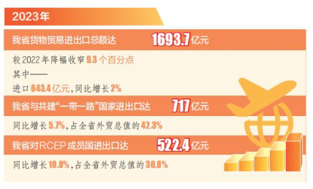 本報訊(記者孟婷)2月14日,記者從太原海關獲悉,據(jù)統(tǒng)計,2023年我省貨物貿(mào)易進出口總額達1693.7億元,較2022年降幅收窄9.3個百分點。其中,進口643.4億元,同比增長2%。同期,我省與共建“一帶一路”國家進出口達717億元,同比增長5.7%,占全省外貿(mào)總值的42.3%。我省對RCEP成員國進出口達522.4億元,同比增長10.8%,占全省外貿(mào)總值的30.8%。