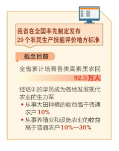 2014年開展農(nóng)民教育培訓(xùn)工作以來(lái),我省各級(jí)農(nóng)業(yè)農(nóng)村部門圍繞全面支撐糧食安全和重要農(nóng)產(chǎn)品穩(wěn)定供給,統(tǒng)籌推進(jìn)農(nóng)業(yè)經(jīng)理人、農(nóng)村創(chuàng)新創(chuàng)業(yè)者、鄉(xiāng)村治理及農(nóng)村社會(huì)事業(yè)發(fā)展帶頭人和種養(yǎng)加能手等六大類開展培訓(xùn),為推進(jìn)鄉(xiāng)村全面振興提供了有力人才保障。我省還在全國(guó)率先制定發(fā)布20個(gè)農(nóng)民生產(chǎn)技能評(píng)價(jià)地方標(biāo)準(zhǔn),建立了涵蓋主要農(nóng)作物種植品種和畜禽養(yǎng)殖品種的技能評(píng)價(jià)標(biāo)準(zhǔn)體系。截至目前,全省累計(jì)培育各類高素質(zhì)農(nóng)民92.5萬(wàn)人,高素質(zhì)農(nóng)民培育績(jī)效考核持續(xù)排在全國(guó)優(yōu)秀行列。經(jīng)培訓(xùn)的學(xué)員活躍在農(nóng)業(yè)生產(chǎn)經(jīng)營(yíng)各領(lǐng)域,成為各地發(fā)展現(xiàn)代農(nóng)業(yè)的生力軍,從事大田種植的收益高于普通農(nóng)戶10%,從事養(yǎng)殖業(yè)和設(shè)施農(nóng)業(yè)的收益高于普通農(nóng)戶10%—30%。