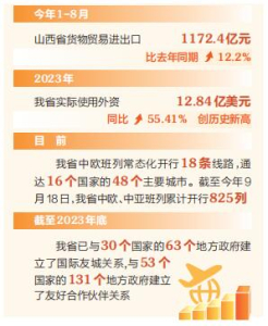 牢記殷殷囑托,奏響開放強(qiáng)音。當(dāng)前,全省上下牢記習(xí)近平總書記殷殷囑托,堅(jiān)定不移推進(jìn)更高水平對(duì)外開放,著力優(yōu)化開放布局、推進(jìn)制度型開放、促進(jìn)對(duì)外貿(mào)易擴(kuò)量提質(zhì)、提升開放平臺(tái)能級(jí)、建設(shè)開放通道、提升投資貿(mào)易便利化、加強(qiáng)開放創(chuàng)新能力合作,加快構(gòu)建起多元發(fā)展、多點(diǎn)支撐的全面開放新格局,作為內(nèi)陸省份,山西對(duì)外開放的力度越來越大。